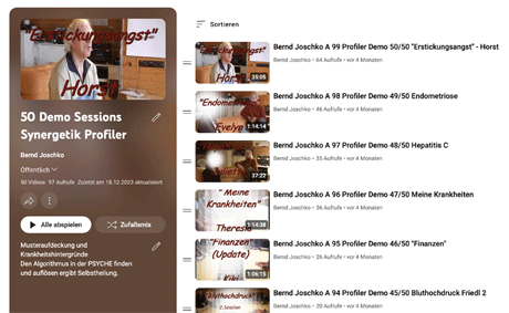 Echte Heilung ist immer Selbstheilung. Eine Methode kann nur dabei helfen. Daher kann niemand heilen - die Schulmedizin schon mal garnicht. Sie bekämpft nur die Symptome. Wer weiß schon im Einzelfall, ob die Chemo beim Überleben oder Sterben geholfen hat. Jeder muß sich selbst heilen, denn sein Leben hat ihn krank gemacht. Also gilt es als erstes herauszufinden, was im Hintergrund arbeitet - im Gedächtnisspeicher PSYCHE. Dazu wurde der Synergetik Profiler schon 2001 von Bernd Joschko entwickelt. Er deckt präzise auf. Die nebenstehende Playlist von Youtube startete vor 10 Jahren und zeigt 80 Beispiele. Die Videos wurden ca. 250.000 mal angeklickt. |