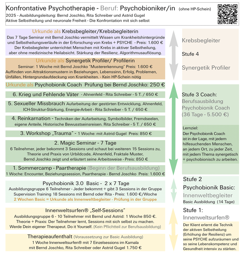 Coach und Therapeut. Psychobionik Magic - 6 Teilnehmer bekommen von Bernd je 3 Sessions in der Gruppe. Ein sehr intensives Lerntraining zum erleben, wie präziese Bernd arbeitet. Sommercamp (alle 2 Jahre): Hier wird Ausbildungsstoff zum Thema Paartherapie und Encounter praktisch vermittelt. Mentalsessions und Manifestation sind weitere Bausteine. Reinkarnation mit Rita vermittelt, wie Innenweltbegleiter mit Symbolbilder umgehen und diese synergetisch integrieren. Psychobionische Reinkarnation ist für Anfänger gedacht. Im Seminar "Missbrauch" vermittelt Rita ihre umfangreichen Erfahrungen mit sexuellem Missbrauch und der nachhaltigen Transformation.