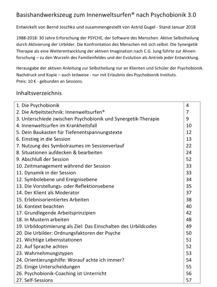 zum Innenweltsurfen® Von der Synergetik Therapie zur Psychobionik 3.0 - Aktive Selbstheilung auf höchstem Niveau. Dazu gibt es nun ein Basishandwerkszeug für Menschen, die sich selbst heilen wollen. Alle Erkenntnisse und Gesetzmäßigkeiten im Überblick zur praktischen Anwendung. Dieses Heft mit 60 A4 Seiten gibt es für 10 € beim Bernd Joschko Verlag oder den Psychobioniker zu kaufen, wenn eine Session dazu absolviert wird. Die neue erlebnisorientierte Psychotherapie ist da. Buchen Sie eine Therapiewoche, um sie praktisch zu erfahren und somit die Grundlagen zu erlernen. Von den höchsten Gerichten in Deutschland positiv bewertet und in weiten Bereichen ohne HP-Schein frei anwendbar. Selbstheilung: Niemand kann Dich heilen - nur Du selbst. Selbst wenn Du Krebs hast, braucht es gerade Dich, denn Krebs fällt nicht vom Himmel. Der neue Trend: Heile-Dich-selbst.de |