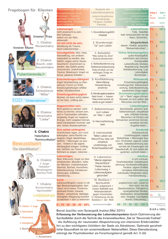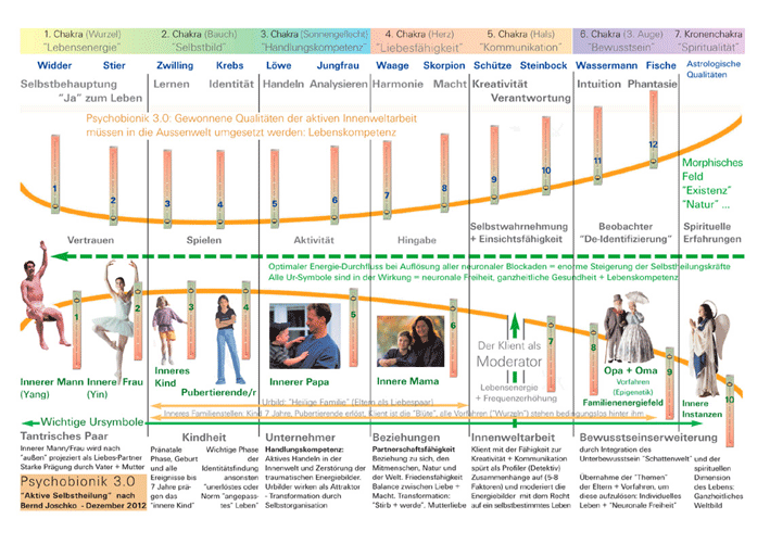 noch nicht stattgefunden hat. Durch die innere Arbeit auf der Symbolebene der Urbilder kann ein optimaler Zustand der PSYCHE wieder hergestellt werden und Krankheiten lösen sich auf. Die Lebensenergie fließt wieder. Die Ergebnisse der Forschung mit der Psychobionik 3.0 Methode zeigen auf, daß es einen Zusammenhang zwischen dem Fließen der Lebensenergie und der guten Ausprägung der Qualitäten der verschiedenen Chakren kommt, wenn diese optimiert werden. Ein direkter Zusammenhang zwischen den verschiedenen Qualitäten der Chakren und den inneren Symbolbildern wurde als Grafik entworfen - siehe Oben. |