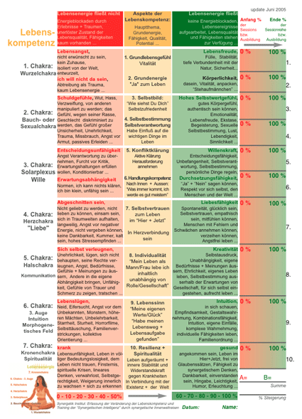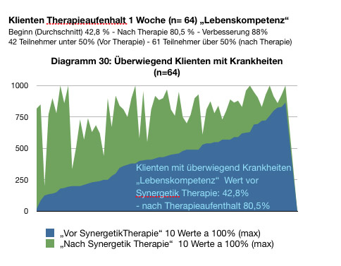von n= 292 Teilnehmer. Den höchsten Profit erlebten Klienten mit Krankheiten - n=64. Hier verbesserte sich die abgefragte Lebenskompetenz von 42,8% vor der Therapiewoche auf 80,5% nach dem Therapieaufenthalt. Dies bedeutet eine relative Verbesserung um 88%. Die Methode hat in den letzten 15 Jahren eine wesentlich verbesserte und nachhaltig wirkende Version erhalten: Synergetik Therapie 13.0 entspricht = Psychobionik 3.0 Echte Heilung ist immer einhergehend mit einer Steigerung der Lebenskompetenz. Menschen mit schweren Krankheiten tragen immer viele und schwierige unverarbeitende Erlebnisse des Lebens in sich, wobei die PSYCHE bis ins Ahnenfeld reicht. Wir arbeiten rückwärts bis in die 4. Generation, da die PSYCHE fraktal aufgebaut ist. Weitere Diagramme und zum Fragebogen - klicken |