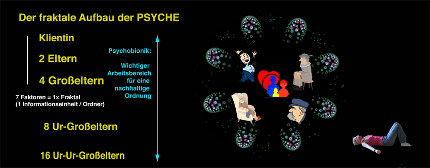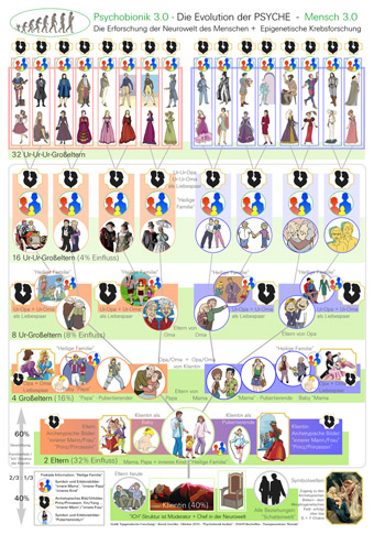 Die heilige Familie als Urbild, das innere Kind und die Liebenden, sowie deren Vertretung in der Ahnenreihe. Die PSYCHE ist fraktal aufgebaut und spiegelt überall diesen einfachen Zusammenhang wider. Die Summe der Verletzung der Urbilder bilden dann Krankheitshintergründe und produzieren Krankheiten, die aber eigentlich nur Symptome der Informationsebene der Familiengeschichte sind. Einzelne innere Symbolbilder sind demnach: Das innere Kind, die innere