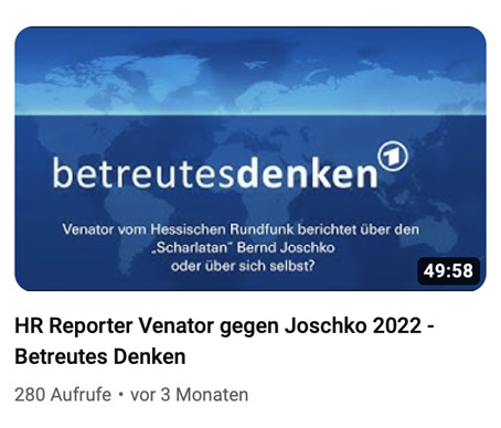 | Betreutes Denken 2022 Stefan Senator vom Hessischen Rundfunk machte "under cover" - heimlich - Videoaufnahmen von Sessions mit Bernd Joschko und veröffentlichte sie im Aug. 2021 im Fernsehen. Er hatte sich ausgedacht Lungenkrebs zu haben. In der ersten Sessions kam hoch als Kind missbraucht zu werden. Angeblich hatte er sich das auch ausgedacht. Hier in diesem Video kann jeder das Originalvideo anschauen. Wurde er missbraucht? Senator hat ständig Angst ... Senator holt sich Aussagen von "Experten", die keine Ahnung von der Synergetik Therapie haben. Alles zusammen eine sehr einseitige Darstellung des Hessischen Rundfunks - betreutes Denken. Wir werden sehr einseitig informiert und zahlen dies mit GEZ Zwangsgebühren. Bernd Joschko wehrt sich und machte diesen Film zu seiner Verteidigung. "Wer ist hier der Scharlatan?". Bernd Joschko kämpft gegen die Übermacht des Fernsehens, doch die höchsten Richter in Deutschland sind auf seiner Seite und geben ihm Recht: Joschko ist kein Scharlatan sondern ein Pionier der neuen Zeit. Siehe auch https://www.rasterfahndung.net |